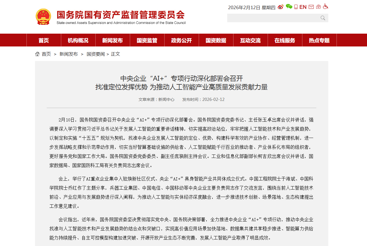 行业资讯 | 2026/02/12 中央企业“AI+”专项行动深化部署会召开 找准定位发挥优... 2月10日,国务院国资委召开中央企业“AI+”专项行动深化部署会。国务院国资委党委书记、主任张玉卓出席会议并讲话,强调要深入学习贯彻习近平总书记关于发展人工...
